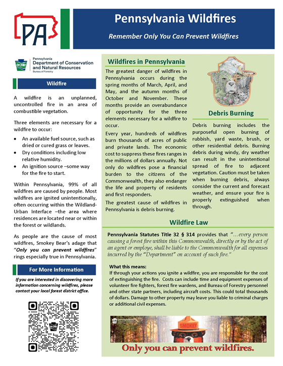 Wildfires are a powerful and destructive force of nature, but in Pennsylvania, they are almost entirely preventable. In fact, 99% of wildfires in the state are caused by human activities, often unintentionally. Accidental fires destroy property but, more importantly, they place lives at risk, including the lives of our firefighters who answer the call to contain these often quick-moving fires.